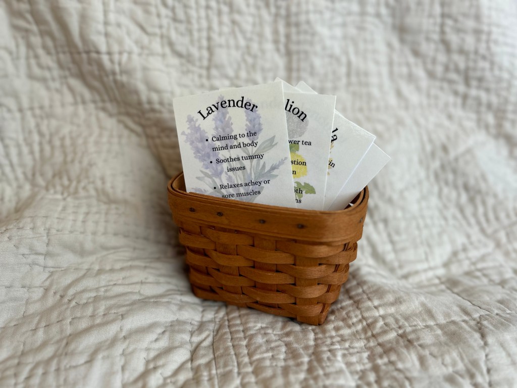 If you’re here, I assume you agree with the importance of passing knowledge onto your kids. But how this is done can vary a lot! Where I started was with whatever June was interested in, whatever she gravitated towards, we leaned into that. Or should I say learn–we’re always learning! It’s always a great idea in my book to just take your kids outside, let them roam and wait for their questions to come. If you have an idea of what you want to teach them, bring them the herb/flower and ask them basic questions to get their wheels turning on what you want them to learn that day. Below are herbs that we have learned about together, June loves herself, and are truly key to any basic kit (whether that be an actual kit or a basket of learning cards).