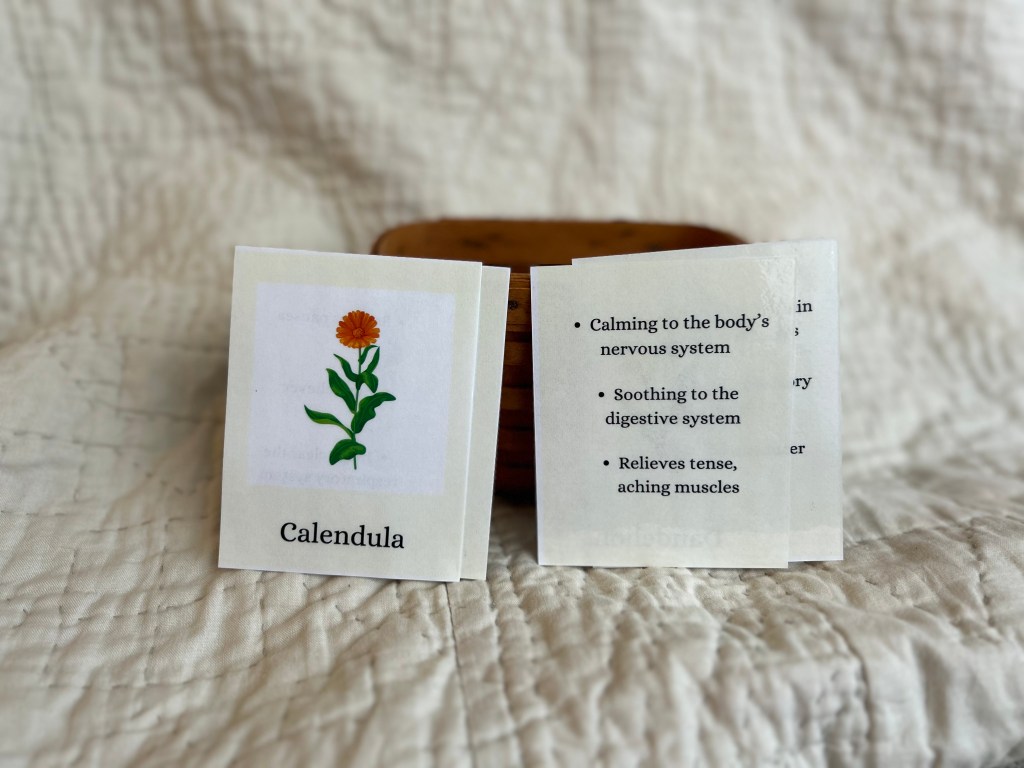 Getting your kids’ wheels turning with interest is a great start! Taking our learning deeper looked a little different. We read books about flowers, trees and seeds as well as playing games. Though we have a board game created for teaching how to use plants to heal, most of our learning has come from using my herb themed playing cards we played a matching game, name that plant game, etc. But I found myself wishing they had the name and some simple facts for each plant on a card. So, I made what I couldn’t find! Below I have a file of printable cards for you to teach your littles with. These cards have the plant name, picture and a few uses for them. They are great for a simple matching game (picture to picture for non readers + picture to name for readers), flash cards/quizzing, school room card garland, and more!