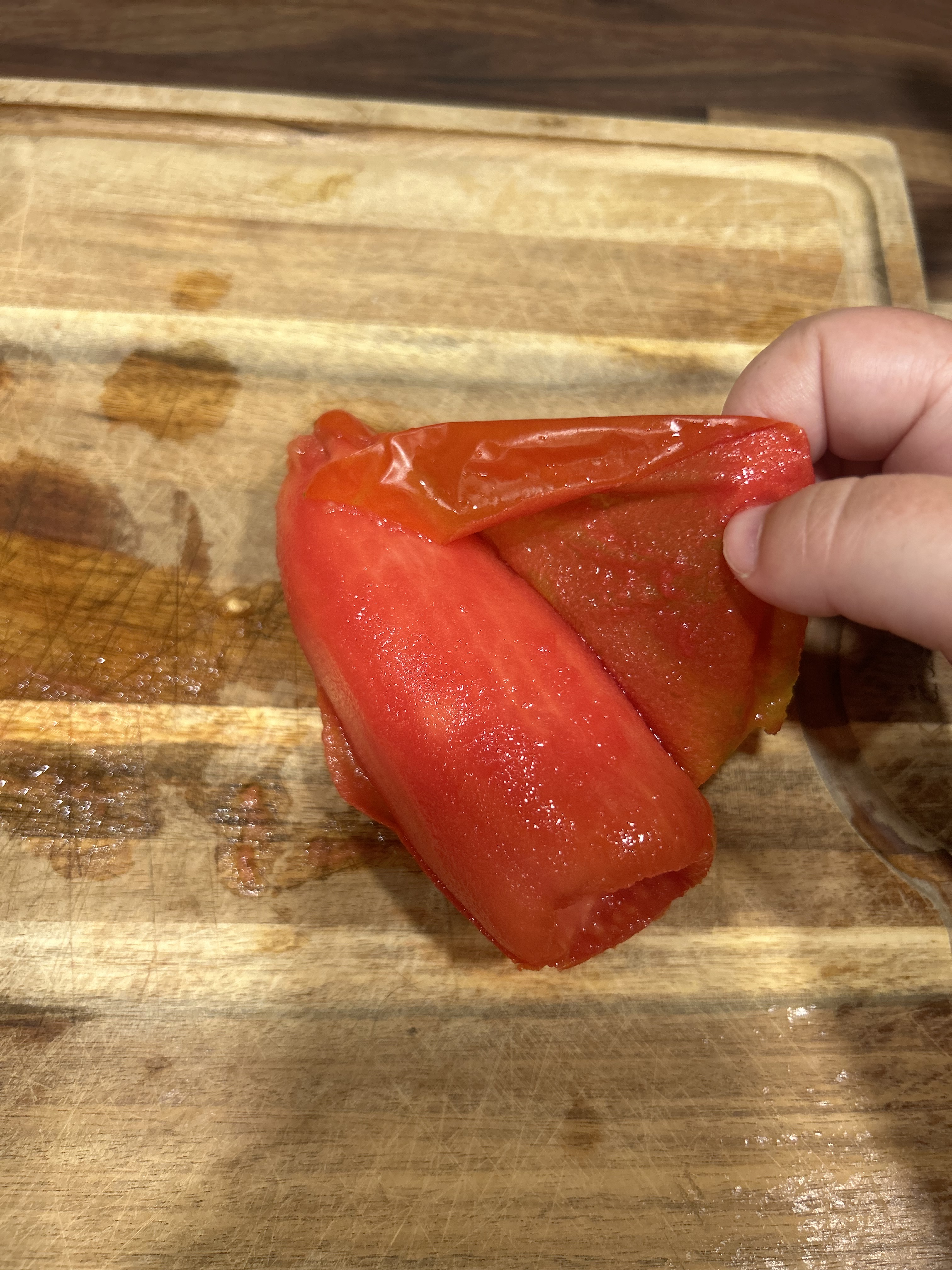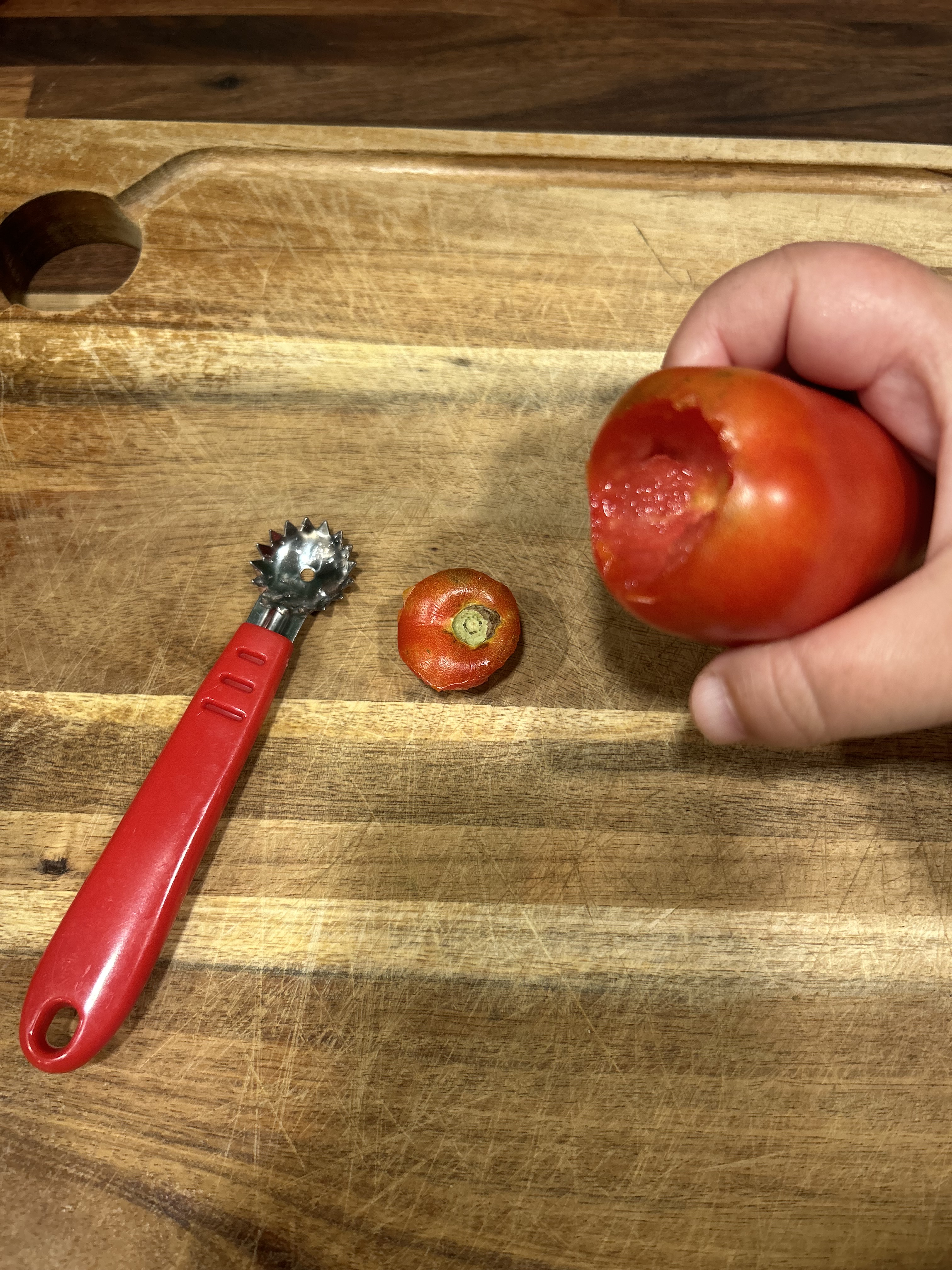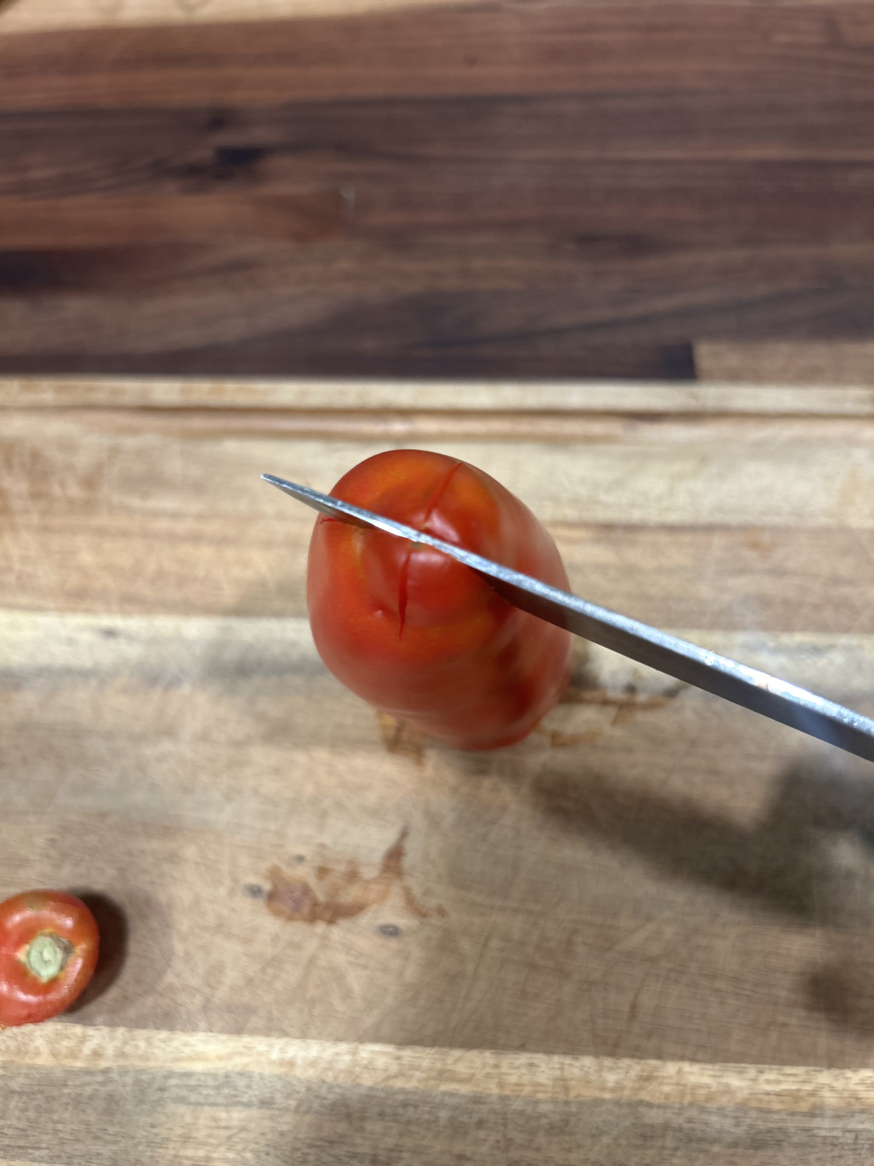Start by giving your tomatoes a good rinse. Next, check for bad spots, if there are any, simply cut those out and toss them to the side. Then, core them and slice an X on the bottom.