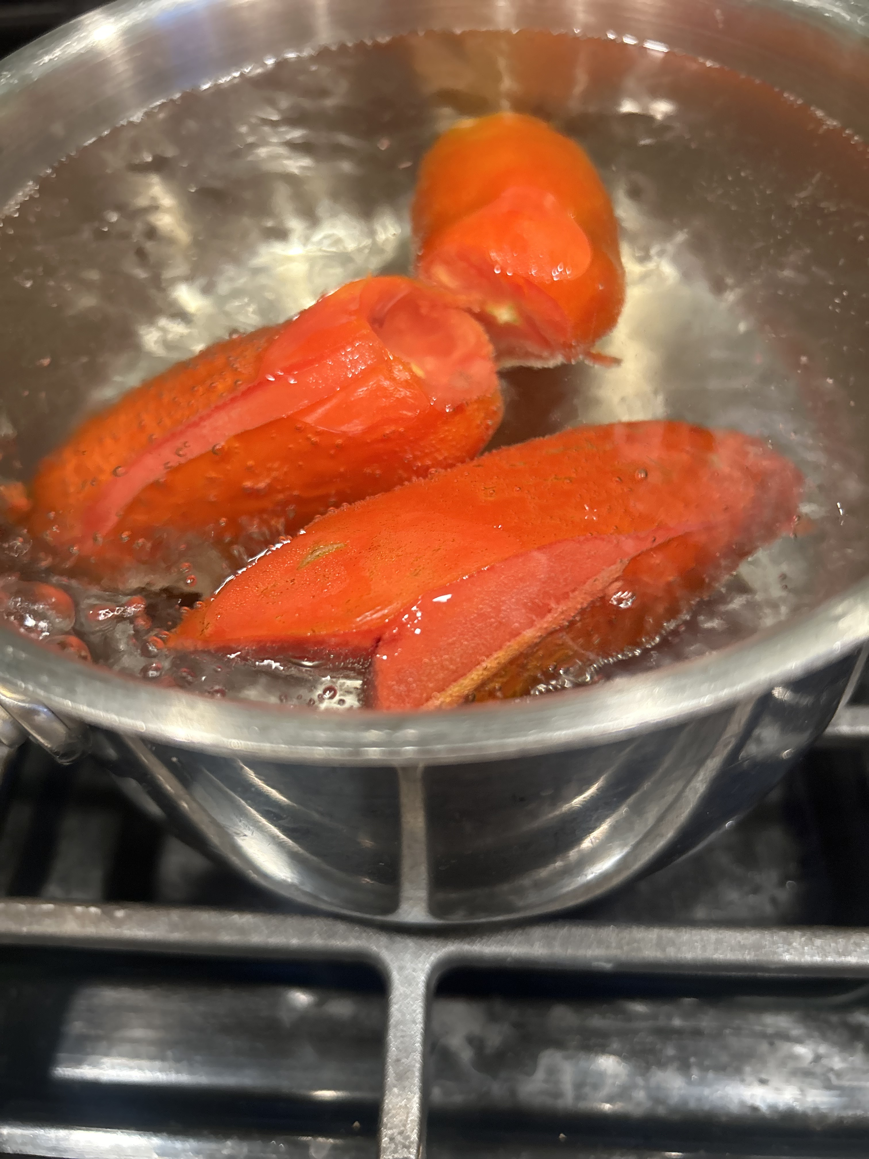 To blanch your tomatoes simply start by boiling a pot of water. Next, Get an ice bath ready. Then, an X in the bottom of the tomato. Place each tomato in the pot for 5 ish seconds or until you start to see the skin peel back. Next, place them into the ice bath to shock them and stop the cooking. Finally, opal back the skins of the tomato, more times than not the skins slip right off for me. If peeling is difficult, they weren’t blanched quite long enough. After pulling the skin off, quarter or dice them.