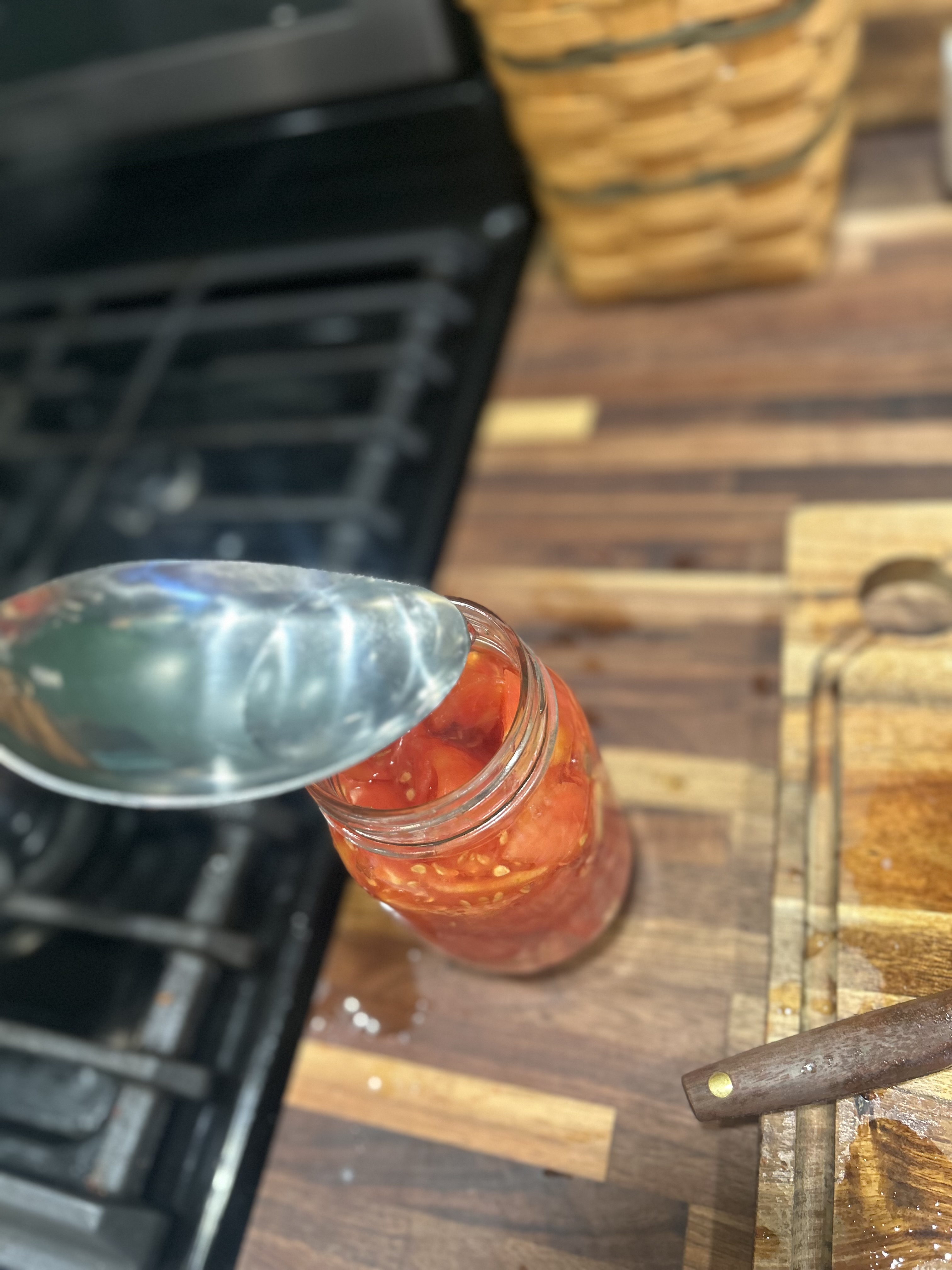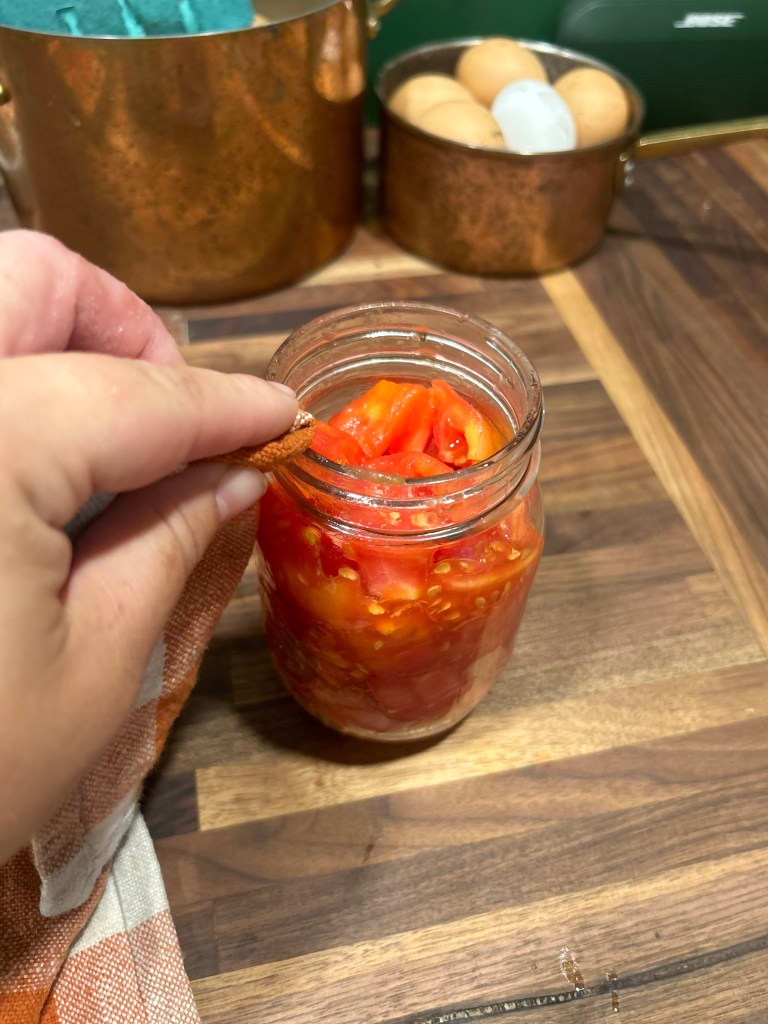 Simply pack the tomatoes as tightly as possible until you are left with ½ inch headspace ( the space from the tomato level to the rim of the jar). All canned fruit needs to be submerged in water, so depending on how juicy your tomatoes are, you may need to top them off with some hot water. Lastly, take a butter knife to remove bubbles from the jars.