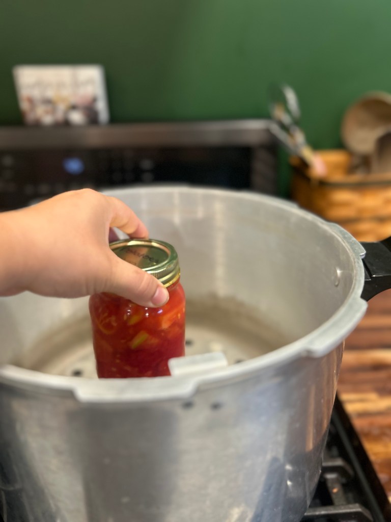 Pressure Canning: Fill the canner with water about a quarter of the way. Lock on your lid and allow your canner to vent for 10 minutes; make sure the pressure button is popping up. Place the weight over the vent and bring the canner up to 10 pounds of pressure. Set your timer for 10 minutes. Once your timer goes off, turn off your burner. Wait for the canner to naturally release most of the pressure, then open the vent. One the pressure is at zero take the lid off and pull your jars out with the jar tongs.