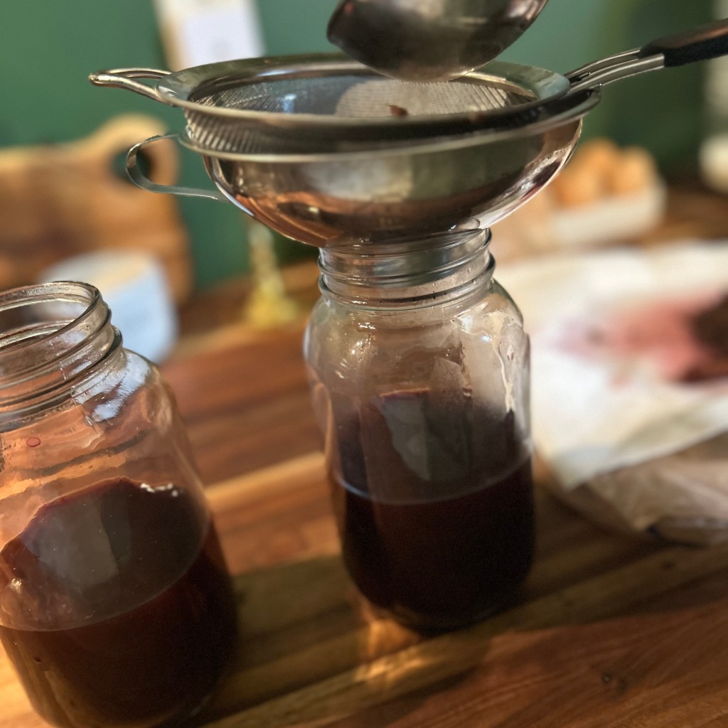Using a sieve and cheesecloth, strain out the liquid making sure to squeeze out the berries themselves as well, into a large jar or bowl, measuring how much total syrup you are left with.